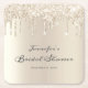Ces dessous de verre personnalisés en parties scintillant et en papier glacé ajouteront de l'éclat à votre douche nuptiale. Ce modèle design chic présente une bordure supérieure de parties scintillant à goutte de champagne sur un arrière - plan brillant. Personnaliser avec un nom et une date dans le script noir moderne.. Conçu par l'artiste Susan Coffey.