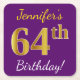 Ce dessous de verre en papier simple comporte un message comme "64e anniversaire de Jennifer!", avec le "64e" ayant une apparence de couleur fausse/imitation or, sur un arrière - plan de couleur violette. Le nom peut être personnalisé. Des dessous de verre de papier personnalisés comme ceux-ci pourraient peut-être être utilisés à une fête d'anniversaire pour quelqu'un qui célèbre son soixante-quatrième anniversaire. [~Z0000197]