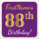 Ce dessous de verre en papier simple comporte un message comme "88e anniversaire de FirstName !", avec le "88e" ayant une apparence de couleur fausse/imitation or, sur un arrière - plan de couleur violette. Le nom peut être customisé. Des dessous de verre de papier personnalisés comme ceux-ci pourraient peut-être être utilisés à une fête d'anniversaire pour quelqu'un qui fête son quatre-vingt-huitième anniversaire. [~Z0000197]
