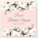 Élégantes roses blanches délicates sur le haut et le bas de ces dessous de verre pour baby shower rose poudré, détails de personnalisation en typographie grise.
