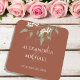 Ce design comprend un élégant dessous de verre de verdure fleurie en terre cuite avec un élégant ampersand de calligraphie, avec feuillage vert feuille feuille botanique, un jardin de fleurs blanches simple minimaliste, une boisson de réception de mariage, des fournitures de papier de fête de mariage, un ampersand traditionnel classique créatif, une mariée mariage et des noms de mariés, un bloc simple lettrant style minimal, avec de belles couleurs de la nature.