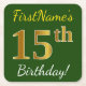 Ce dessous de verre en papier simple comporte un message comme "15e anniversaire de FirstName!", le "15e" ayant une apparence de couleur fausse/imitation or, sur un arrière - plan vert. Le nom peut être personnalisé. Des dessous de verre de papier personnalisés comme ceux-ci pourraient peut-être être utilisés à une fête d'anniversaire pour quelqu'un qui célèbre son quinzième anniversaire. [~Z0000196]