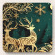 Une illustration ornée de style découpage en papier, riche en or et en vert, représentant des cerfs baroques jumeaux dans une forêt de conifères enneigée. Des silhouettes détaillées et des motifs tourbillonnants évoquent l'enchantement et le mystère de la saison. Des flocons de neige, des étoiles et une lune lumineuse complètent la scène, ajoutant de la profondeur et de la sérénité à ce design de vacances intemporel.