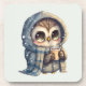 Dessous de verre de liège avec un kawaii illustration d'un hibou aux yeux grands dans une robe d'hiver et foulard tenant un café chaud.