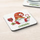 These fun drink coasters feature a cute image of a gnome elf dressed in a red and gold reindeer pattern Santa hat. He holds a Santa Claus wine glass in one hand, and a red and white striped candy cane in the other. At the bottom is a custom text field, which is shown saying Cheers! in matching green.