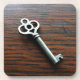 Photographie d'une clé squelette ornée sur une boite en bois.