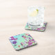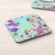 Dessous de verre à thème d'été avec des tons aqua et un collage de fleurs tropicales dans les tons mauves et violets.