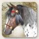 Œuvre d'art numérique originale de Jayne Wilson représentant un portrait de tête d'un poney indien Appaloosa avec une bride rouge, avec des accents dorés et des plumes.