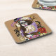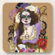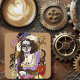 Vaporiste jour de la femme morte portant le maquillage du crâne à sucre. Robe principalement en violet. Autour d'elle sont des engrenages, le crâne, l'horloge, les roses et les clés.
