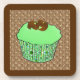 Cupcake avec glaçage à la menthe verte surmonté de boucles de chocolat, dans un emballage de cupcake fractal vert décoratif, sur un dessous de verre arrière - plan à motif tourbillon marron et beige