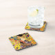 Coasters featuring Gustav Klimt's oil painting Lady with Fan (1918). A woman wearing a blue kimono holds a red fan against a fol yellow background of flowers and peacocks. A great gift for fans of Japonisme and European art