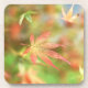 Sur fond de feuilles d'été verts d'une érablière japonaise poussant vers les rouges et les jaunes d'automne, une feuille de squelette rose et d'or dérive lentement vers le sol.
