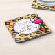 Dessous de verre pour une soirée bachelorette. Un léopard tache motif pour un arrière - plan. Un verre à vin à l'allure cool, surmonté d'une épaisse encre noire. Le vin à l'intérieur du verre est rose chaud. Couleurs vives et vives. Personnalisez avec vos infos de bachelorette sur un cercle blanc dessiné à la main. Dernier fling avant l'anneau écrit dans une police cool tendance.