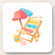Un design estival et coloré avec chaise longue, parasol rayé, chapeau de paille, étoile de mer et panier fleuri. Style aquarelle doux et joyeux, parfait pour célébrer les joies de l'été.