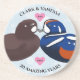 Fêtez n'importe quel anniversaire mariage avec cet élégant dessous de verre en grès, qui dispose d'une belle paire stylisée de Arlequin plongeur! Un lettrage élégant avec des confettis hexagonaux sur un arrière - plan bleu clair ajoute une touche mémorable pour cette occasion spéciale et cette étape importante. Customiser avec les noms des oiseaux de l'amour et les années de mariage. Design © W.H. Sim. Voir plus sur zazzle.com/expressionsoccasions