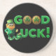 Un Leprechaun amusant en costume vert avec barbe rouge et une pièce d'or à la main vous souhaite bonne chance !
