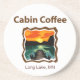 Illustration inspirée de la coupe de bois qui consiste à coucher le soleil sur le quai et le lac, avec le titre de café Cabine sur le quai, ce qui rend la boisson parfaite pour le cabine, ou à sortir sur le bateau.