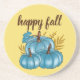 Classiques dessous de verre de citrouilles bleues d'automne ! Une citation de typographie tendance dit "heureux automne". Trois jolies citrouilles bleues colorées avec des feuilles d'automne. Fond doré automnal. Prêt pour vos boissons préférées !
