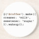 Mmmm… Appréciez du café délicieux de Javascript. Lait et sucre svp. $("#coffee ").make ({crémeuse : "lait", édulcorant : "sucre"}) .wakeup () ;