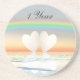 Dessous de verre avec ma conception originale de deux coeurs en papier, représentant un an de mariage, flottant sur l'eau sous un arc-en-ciel. Le texte personnalisable dit "1 an".