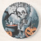 Une scène d'Halloween éffrayante avec un squelette à l'intérieur d'un citrouille, entourée d'éléments étranges.