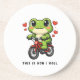This kawaii cycling frog design features a happy frog riding a bicycle in a playful cartoon style. Clean lines and bright colors make it perfect for stickers, phone cases, apparel, and everyday accessories.