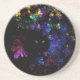 Un dessous de verre en grès sur mesure avec un chat fractal noir entouré de feuilles colorés.