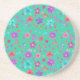 Un joli dessous de verre rond en grès, avec un motif de fleurs vives en violet, turquoise, rose et orange sur un arrière - plan d'aqua, d'un collage de papier peint à la main par Judy Adamson. Vous pouvez facilement changer la couleur de l'arrière - plan, si vous le souhaitez, en utilisant le bouton Modifier.