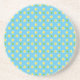 Un dessous de verre rond, en grès ou en natte, avec un motif de primroses jaunes et de pois verts sur un arrière - plan bleu turquoise : une partie de la collection Posh & Painterly 'Primroses'.