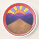 Cet article de géologie présente un croquis d'un ventilateur alluvial sous forme de logo rond et coloré. Le design circulaire comprend un soleil bas se levant sur une chaîne de montagnes avec un grand ventilateur alluvial. Le plus visible dans le désert, un ventilateur alluvial est un grand amas d'alluvions (sédiments) en forme de ventilateur qui est lavé des montagnes par l'eau. Ce serait un grand cadeau pour votre sédimentologue ou néotectoniste préféré.