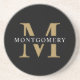 Ce dessous de verre de grès moderne minimaliste personnalisé a un monogramme or scindé initial avec nom à l'intérieur sur un arrière - plan noir.