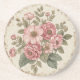 A circular wreath of blush‑pink blooms and tender green leaves sits at the center, painted with a gentle, vintage delicacy. The flowers—reminiscent of old‑garden roses—feel both lush and slightly faded, as if touched by years of sunlight. Surrounding the bouquet is a cream background with a distressed, tea‑stained texture, framed by a softly weathered brown border that gives the entire piece an antique, well‑loved character. The overall effect is warm, romantic, and nostalgic—classic shabby chic with a whisper of French country charm.
