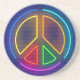Graphic of a multicolored neon peace sign symbole against a brick wall background