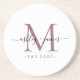 Celebrate your marriage monogram sandstone coaster, featuring monogram in mauve purple, your names in black elegant calligraphy and the year established on a white background. Perfect wedding or engagement gift! Exclusively designed for you by Happy Dolphin Studio.