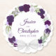 Ces jolis dessous de verre apporteront la touche de fête parfaite à votre réception de mariage. Ils présentent un magnifique dessin à l'aquarelle peint à la main avec une couronne florale dans des tons de pourpre, de violet, de lavande et de prune. Les roses et les fleurs sont entourées de brins de feuilles d'eucalyptus et de verdure avec un beau nœud blanc en bas. Le design élégant mais simple de style bohème chic comprend les noms des mariés en lettrage script fantaisie ainsi que la date du mariage.