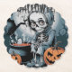 Une scène d'Halloween éffrayante avec un squelette à l'intérieur d'un citrouille, entourée d'éléments étranges.