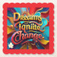 Un design vibrant avec le texte "Dreams Ignite Change" dans un éventail éclatant de couleurs, accentué de touches dorées qui brillent comme des étoiles. La typographie audacieuse est entourée de formes abstraites et de motifs tourbillonnants, symbolisant l'énergie et le potentiel de la créativité. Cette pièce incite les spectateurs à embrasser leurs aspirations et à les transformer en réalité."Image originale générée par Meta AI. L'IA a généré des oeuvres d'art. Licence CC BY-SA 4.0.
