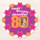 dessous de verre de papier fête du 80e anniversaire. Idéal pour ajouter une touche personnelle à une fête de 80ème anniversaire surprise. Personnalisez avec votre photo de fille d'anniversaire dans le 0 de 80 et personnalisez avec votre choix de nom. Conception par Sarah Trett.