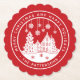 Joyeux Noël Joyeux Happy Holidays Winter Personnalisé Nom Papier Dessous de verre présente le texte "Joyeux Noël et Joyeux Fêtes" dans un script blanc moderne sur un arrière - plan rouge et personnalisé avec votre nom autour d'une maison avec des arbres de Noël et des flocons de neige. Parfait pour Noël et fêtes de fin d'année. Conçu par ©Evco Studio www.zazzle.com/store/evcostudio