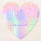 Un arrière-plan iridescent tendance avec licorne et couleurs pastel arc-en-ciel en rose, violet, rose doré, vert menthe. Décoré de gouttes de paillettes fausses en rose doré, rose et violet. Lettres violettes. Personnalisez et ajoutez votre nom écrit avec un style de lettrage à la main de mère. Parfait pour une fête d'anniversaire, une douche de mariée ou une baby shower.