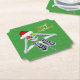 Ces dessous de verre en papier ont un squelette sot tenant des ornements de Noël jusqu'à ses yeux portant un chapeau de Père Noël rouge sur un arrière - plan vert avec des étincelles d'or faux et le texte Joyeux Noël en or.