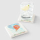 Une montgolfière orange vif, transportant 2 silhouettes. Le ciel est un mélange de roses et de bleus tourbillonnants et le sol en contrebas est recouvert de montagnes et d'une forêt d'arbres.