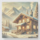 Scène d'hiver d'inspiration alpine, avec un chalet confortable entouré d'arbres enneigés et de majestueuses montagnes. Parfait pour la décoration rustique, l'art saisonnier et l'inspiration de vacances !