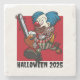 Un souvenir fou de dessous de verre clown en pierre pour vos invités de fête d'Halloween. Utilisez "Personnalisez ce modèle" pour modifier le texte "HALLOWEEN 2025" et faire un cadeau unique et customisé. A emporter de la fête d'Halloween, avec un clown coloré et maniaque brandissant une tronçonneuse orange, avec des cheveux bleus sauvages et portant un rouff, des chaussures clowns massives et des leggings et manches rayés.