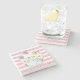 Dessous de verre en pierre avec arrière - plan rayé rose et blanc. Un cadre circulaire blanc avec une bordure rose superposée. A l'intérieur du cadre une illustration d'une mère et un bébé lapin debout ensemble. Bouches jaunes dans l'arrière - plan. Des papillons géants.