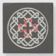 Un dessous de verre en pierre avec un noeud celtique avec une croix carré rouge au centre.