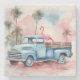 Aquarelle flamingo en camion bleu rétro avec palmiers.