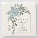 Dessous de verre de mariage à l'arc et à l'initiale, fleurs d'aquarelle bleu poussiéreux. Ce joli design mariage dispose d'une arche avec des fleurs de cactus bleus et des feuilles dans le coin gauche et vos initiales. Les noms sont en typographie de script.
