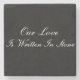 Dessous de verre en pierre présenté en marbre de couleur noire avec le texte : Notre amour est gravé dans la pierre. Personnalisez cet article, changez la pierre, ajoutez des noms ou achetez tel quel..
