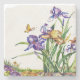 D'une peinture d'aquarelle d'un groupe d'iris de drapeau bleu imberbe et de drapeau jaune s'élevant dans le jardin. Planer en haut est un papillon jaune sensible, appréciant les belles fleurs de ressort autant que nous faisons.